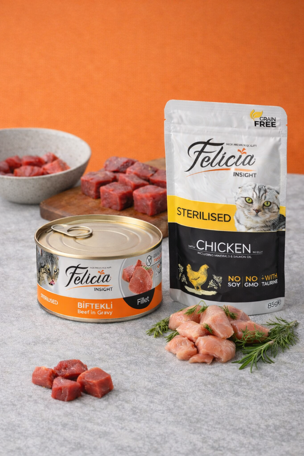 Felicia tahılsız konserve kedi mamaları, veteriner hekimler ve beslenme uzmanları tarafından özel olarak formüle edilmiştir. Dostlarımızın vazgeçilmez yaşam kaynağı olan Taurin desteği, GDO ve soya içermeyen özel formülü ile benzersiz bir tüketim deneyimine hazır olun.