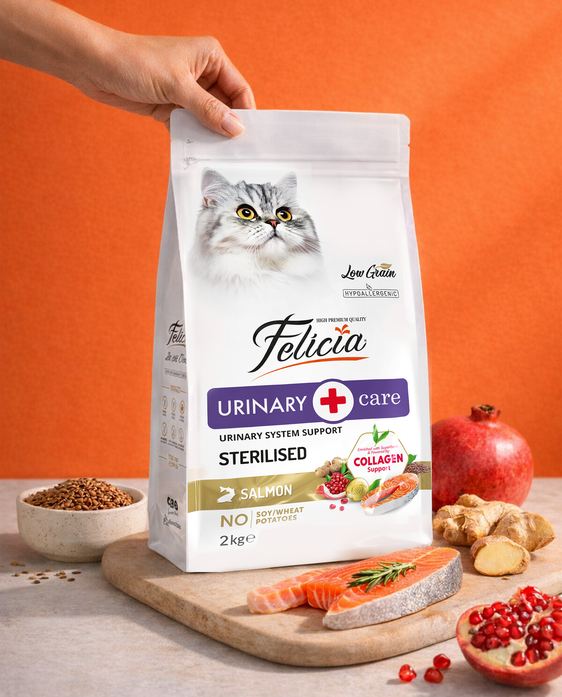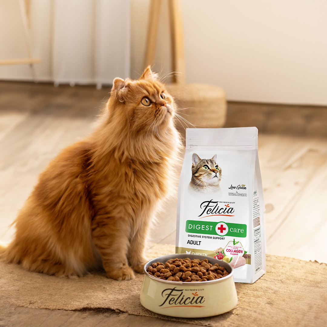 Sevimli dostlarımızın doğal yaşam şartlarına uygun şekilde beslenip, daha sağlıklı yaşayabilmeleri için beslenme uzmanlarımızla birlikte, tahıl oranı düşürülmüş hipoalerjenik özel bir formül hazırladık. Yüksek oranda sindirilebilir hayvansal protein kaynaklarına sahip Felicia, sindirim ve alerji hassasiyetlerine karşı özel olarak geliştirilmiştir. Alerjik reaksiyonlarla ilişkili olan sığır eti, süt ürünleri, buğday, soya, patates, yapay tatlandırıcı, renklendirici, kimyasal aroma ve GDO İçermez!